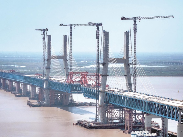 张靖皋长江大桥施工正酣 四座主塔同框亮相